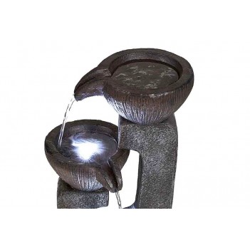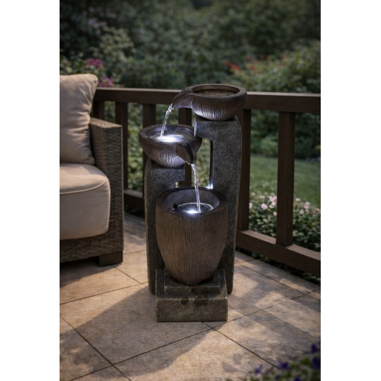 Das hochwertige Harzmaterial sorgt für Langlebigkeit und Witterungsbeständigkeit. Die integrierte LED-Beleuchtung betont den Wasserfluss und verleiht der Fontäne auch bei Dunkelheit eine besondere Atmosphäre.