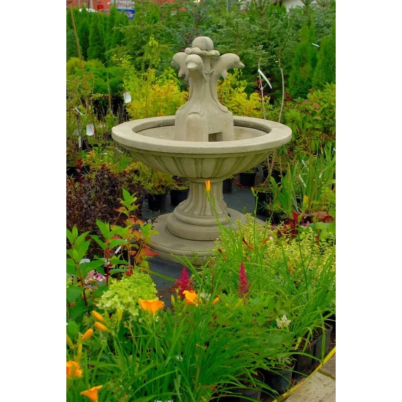 Mittelgroßer Außen-/Innenbrunnen mit einer klassischen Delfinskulptur. Wird komplett mit einem Ring mit Springbrunnendüsen geliefert, der ein schönes Wassergeräusch und einen auffälligen visuellen Effekt erzeugt. Der Springbrunnen ist perfekt für eine trockene Oberfläche, in der Privatsphäre von kleinen und mittelgroßen Gärten. Es wird auch in Teichen verwendet.