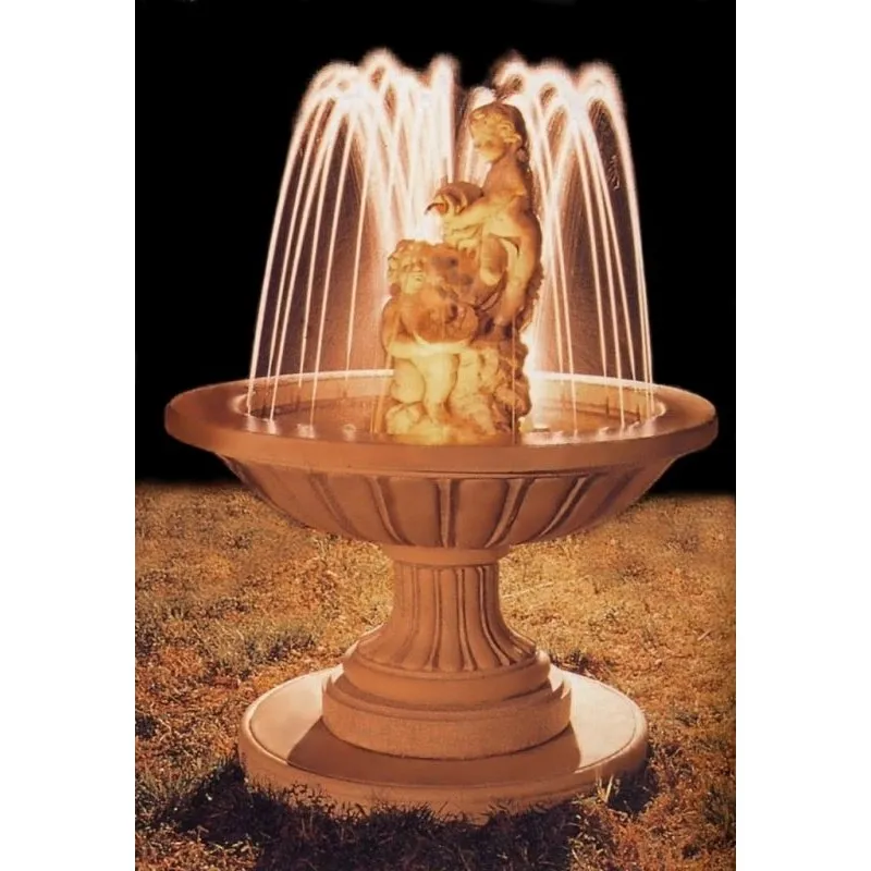 Wasser fließt in der Mitte und an der Seite in das darunter liegende Becken oder Becken. Einer der größten Springbrunnen mit mehreren Entwässerungsquellen, der ein lautes Geräusch von fallendem Wasser erzeugt. Ein repräsentatives Produkt, das als Mittelpunkt zur Dekoration größerer Räume verwendet wird. In Kombination mit Halogenbeleuchtung ergibt sich ein elektrisierender visueller Effekt, der schon von weitem Aufmerksamkeit erregt. Das Produkt ist perfekt für einen Teich, es kann auch auf einer trockenen Oberfläche platziert werden. Die klassische Form des Brunnens ist perfekt für jeden Garten, Park, Restaurant oder Wohnhaus. Mittelgroßer Springbrunnen für den Außen- und Innenbereich. Wird komplett mit einem Ring mit Fontänendüsen geliefert. Es hat zwei Wasserausflussquellen, die ein schönes Wassergeräusch und einen auffälligen visuellen Effekt erzeugen. Der Springbrunnen ist perfekt für eine trockene Oberfläche, in der Privatsphäre von kleinen und mittelgroßen Gärten. Es wird auch in Teichen verwendet.