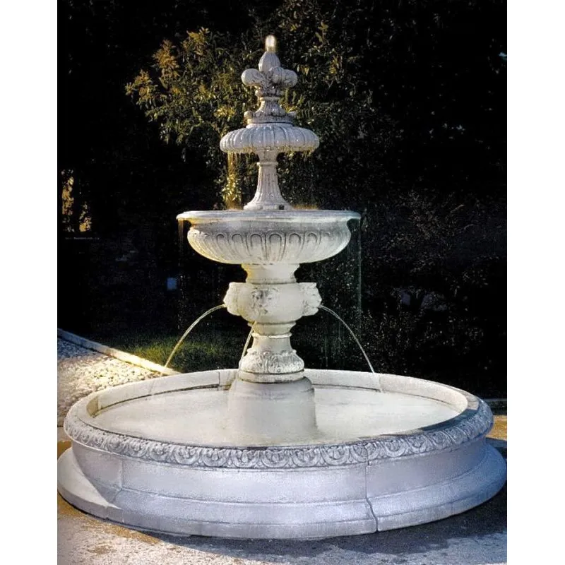 Wasser fließt in der Mitte und an der Seite in das darunter liegende Becken oder Becken. Einer der größten Springbrunnen mit mehreren Entwässerungsquellen, der ein lautes Geräusch von fallendem Wasser erzeugt. Repräsentatives Produkt als Anlaufstelle für größere Dienstleistungs-/Produktionsstätten. In Kombination mit Halogenbeleuchtung ergibt sich ein elektrisierender visueller Effekt, der schon von weitem Aufmerksamkeit erregt. Das Produkt ist perfekt für einen Teich, es kann auch auf einer trockenen Oberfläche platziert werden. Die klassische Form des Brunnens ist perfekt für jeden Garten, Park, Restaurant oder Wohnhaus.