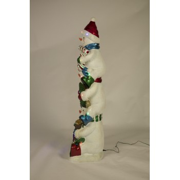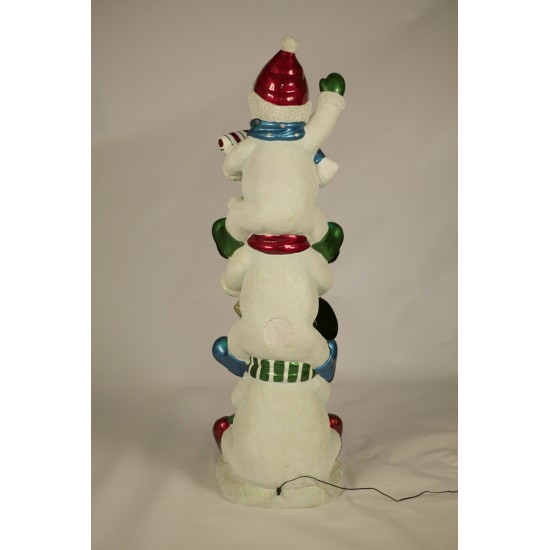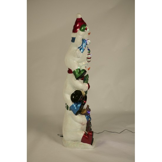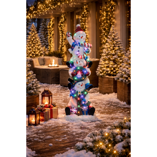 Stacked Joy Snowmen (45 LEDS) gehört zu einer umfangreichen Kollektion von Schneemann-Dekorationen aus wetterbeständigem Fiberglas-Harz und langlebigen Metallkomponenten.