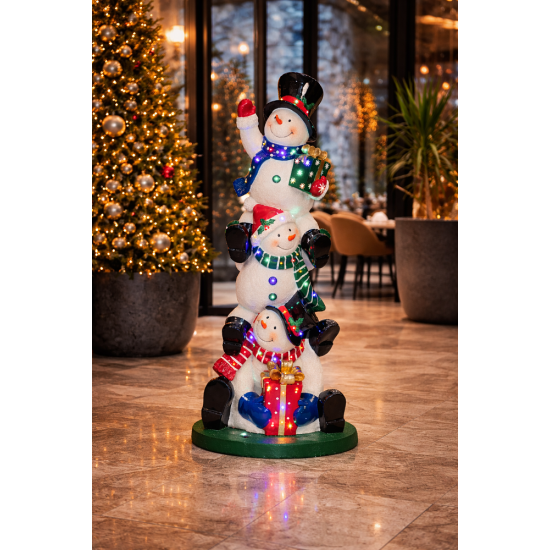 Diese originelle Weihnachtsdekoration zeigt mehrere fröhliche Schneemänner, die übereinander gestapelt sind und eine spielerische Winterstimmung schaffen. Die integrierten 47 LEDs beleuchten die Figur gleichmäßig und verstärken den festlichen Effekt. Dank der Herstellung aus wetterbeständigem Fiberglas-Harz ist die Dekoration langlebig und ideal für den Einsatz in Einkaufszentren, Hotels, Restaurants oder Themenparks geeignet. Die stabile Bodenaufstellung ermöglicht eine einfache Installation und sichere Präsentation.