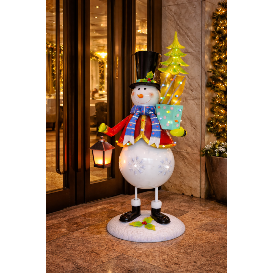Snowman with Tree & Lamp gehört zu einer umfangreichen Kollektion dekorativer Schneemann Figuren für professionelle Weihnachtsinstallationen.