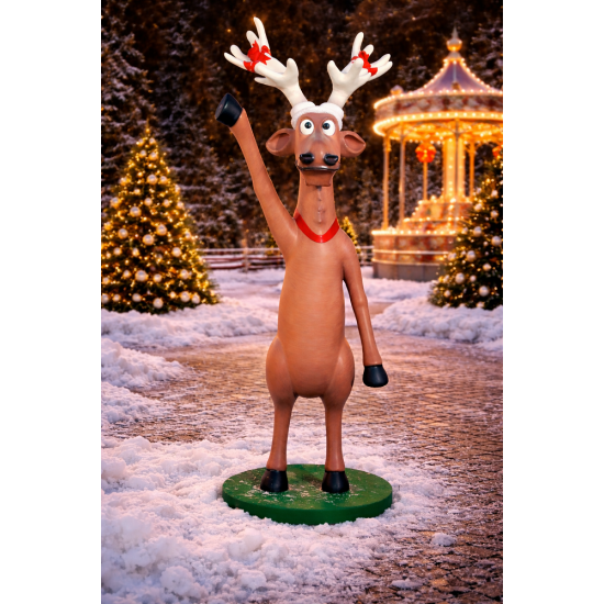 Dasher Raising Hand ist eine lebensgroße Weihnachtsrentier-Dekoration, die ideal für festliche Installationen in Einkaufszentren, Themenparks oder Außenbereichen geeignet ist. Die Figur zeigt eines der berühmten Rentiere des Weihnachtsmanns mit erhobener Hand, als würde es Besucher begrüßen. Die Dekoration hat die Maße L 90 × W 82 × H 204 cm und besteht aus wetterbeständigem Fiberglas-Harz.