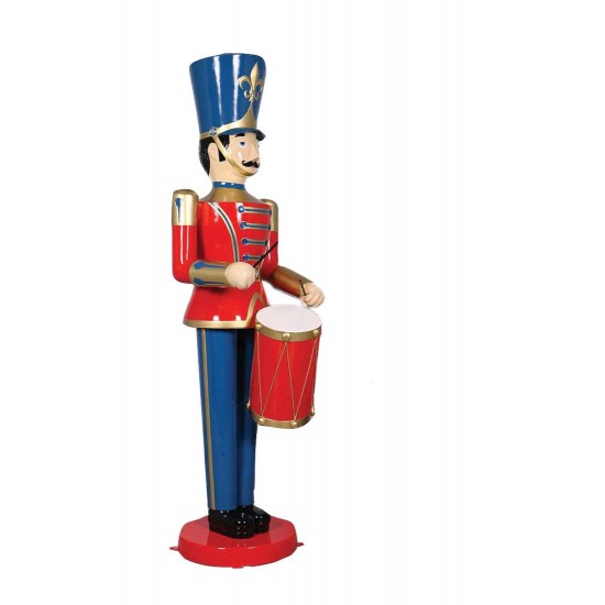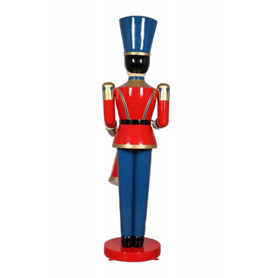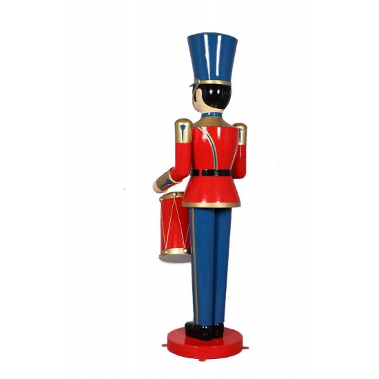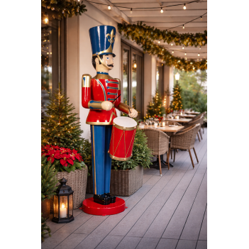 Die Statue zeigt einen klassischen Spielzeugsoldaten mit einer detailreichen Trommel. Das Design erinnert an traditionelle Weihnachtsparaden und dekorative Schaufensterfiguren. Die kräftigen Farben und die sorgfältig modellierte Uniform verleihen der Figur einen nostalgischen und festlichen Charakter.