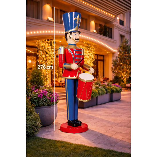 Diese große dekorative Figur eines Spielzeugsoldaten mit Trommel kombiniert traditionelles Weihnachtsdesign mit einer auffälligen rot-blauen Farbgestaltung. Mit einer Höhe von 276 cm zieht sie sofort die Aufmerksamkeit auf sich und eignet sich perfekt als Mittelpunkt einer festlichen Dekoration.