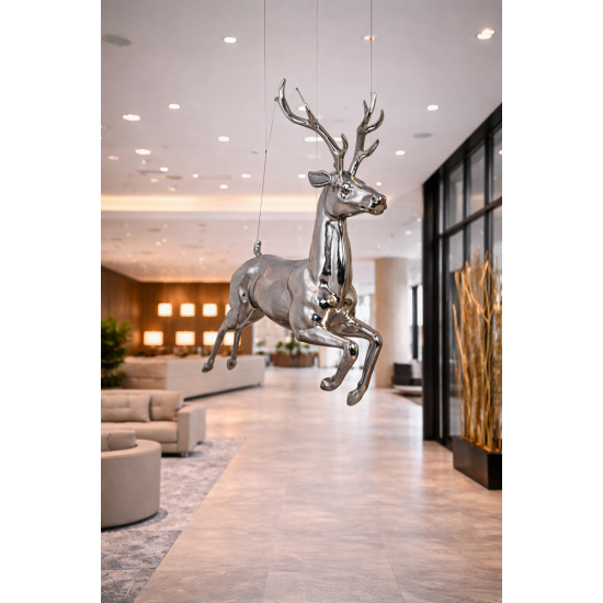 Das silberne hängende Rentier ist eine elegante Weihnachtsdekoration für Einkaufszentren, Hotels, Schaufenster und Eventdekorationen. Die lebensgroße Figur aus wetterbeständigem Fiberglas mit metallischer Oberfläche reflektiert das Licht und sorgt für eine luxuriöse festliche Atmosphäre. Durch die Aufhängung entsteht der Eindruck eines fliegenden Rentiers.