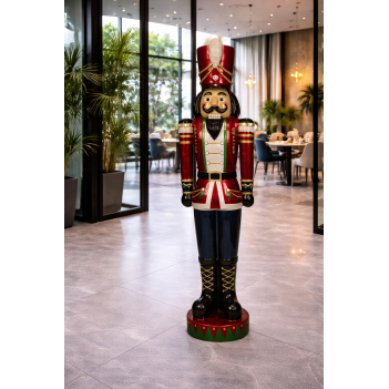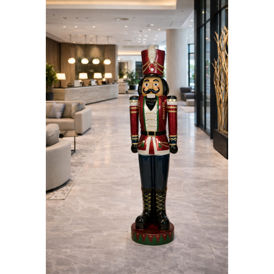 Die beleuchtete Nussknackerfigur ist eine klassische Weihnachtsdekoration in nahezu lebensgroßer Größe. Mit einer Höhe von 192 cm zieht der traditionelle Soldat alle Blicke auf sich und eignet sich perfekt für Weihnachtsdekorationen in Einkaufszentren, Hotels, Restaurants, Schaufenstern oder Außenbereichen.16 integrierte LED-Lichter betonen die dekorativen Details der Figur und sorgen für eine festliche Atmosphäre. Die Kombination aus Fiberglas-Harz und Metall sorgt für Stabilität, Langlebigkeit und Widerstandsfähigkeit gegen verschiedene Wetterbedingungen.Die Figur ist für die Bodenaufstellung konzipiert und kann ideal an Eingängen, in Schaufenstern oder als zentrales Element einer Weihnachtsdekoration platziert werden.