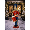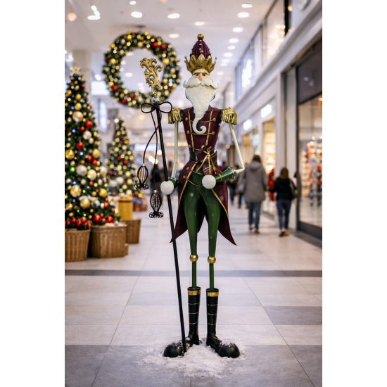 Der Nussknacker mit Krone ist eine beeindruckende Weihnachtsdekoration mit einer Höhe von 191 cm. Die stabile freistehende Metallkonstruktion mit integrierter LED-Beleuchtung sorgt für eine festliche Atmosphäre und eignet sich perfekt für Eingangsbereiche, Gärten, Hotels oder Einkaufszentren.