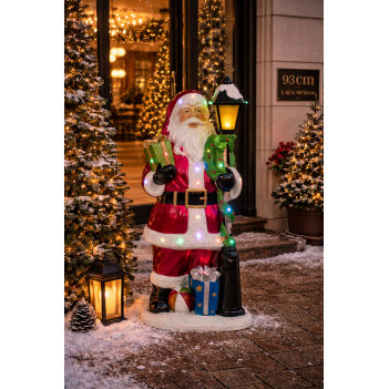 Weihnachtsfigur mit Santa neben einer Lampe mit 22 LEDs. Maße: L 42 x W 33 x H 93 cm. Für innen und außen geeignet.