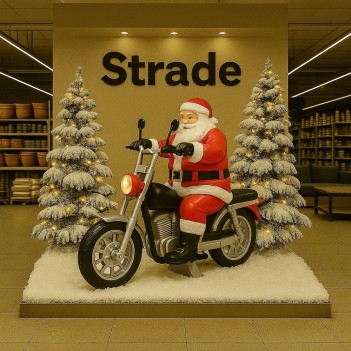 Ein großer Weihnachtsmann auf einem Motorrad gehört zu den Dekorationen, die alle in verschiedenen Ausführungen aus wetterbeständigem Glasfaserharz und langlebigem Metall erhältlich sind