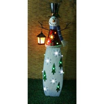 The Snowman with Lamp figure measures L 60 x W 30 x H 172 cm and includes integrated LED lighting. The snowman holds a decorative lamp that softly illuminates the surrounding festive display. Made from durable metal, the prop is designed as a floor-standing decoration suitable for outdoor use.