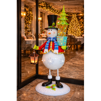 The Snowman with Tree & Lamp is a charming life-size Christmas decoration measuring L 63 x W 53 x H 173 cm. The cheerful snowman wearing a cosy scarf holds a classic Christmas tree while a lamp casts a warm LED glow over the scene. Made from durable metal, this floor-standing decoration is suitable for indoor and outdoor displays, making it ideal for retail spaces, hotels, restaurants, and festive installations.