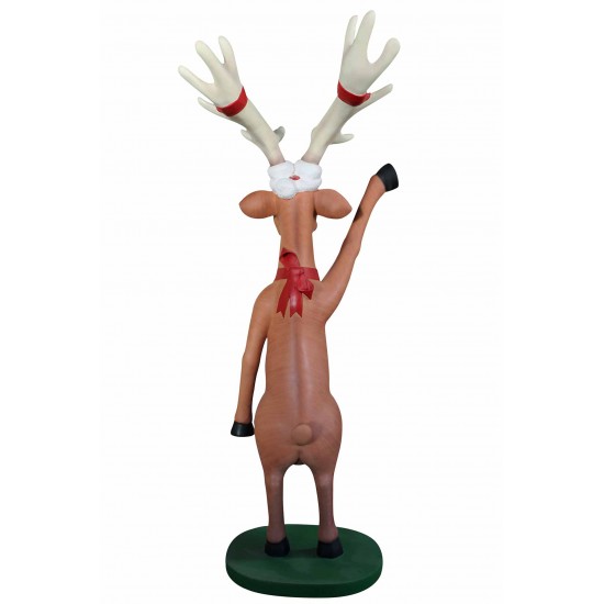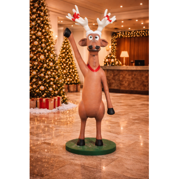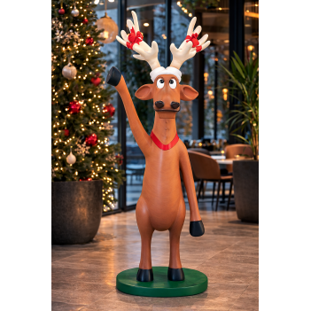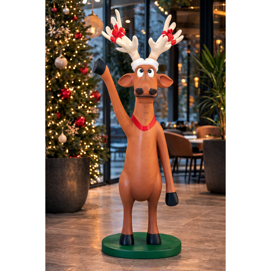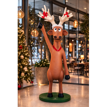 This playful Christmas reindeer statue is designed to bring animation and charm to seasonal decorations. The humorous pose with a raised hand makes Dasher appear as if he is greeting visitors, making it an engaging focal point for Christmas installations in shopping centres, hotels, theme parks or festive markets. Crafted from strong fibreglass resin, the figure is resistant to weather conditions such as moisture, temperature changes and outdoor exposure. The freestanding construction allows easy installation on floors or display platforms. With its natural scale and festive appearance, the decoration works perfectly in both indoor and outdoor holiday scenes. The prop does not include LED lighting, allowing flexible integration with other Christmas illumination elements.