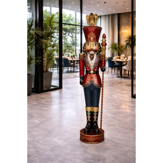 This impressive life-size Nutcracker with Baton is a striking Christmas decoration designed to bring festive charm to any display. Standing 234 cm tall and illuminated by 32 LED lights, the figure features classic royal colours and detailed craftsmanship. Made from durable fibreglass resin, it is suitable for both indoor and outdoor seasonal displays.