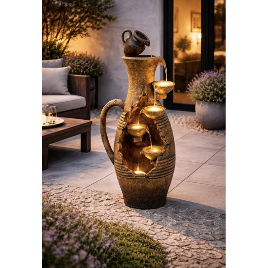 Made from high-quality resin, this product is built to withstand outdoor conditions including rain, frost, and UV exposure. The mains-powered system ensures reliable operation, while integrated LED lighting highlights the water movement beautifully at night.