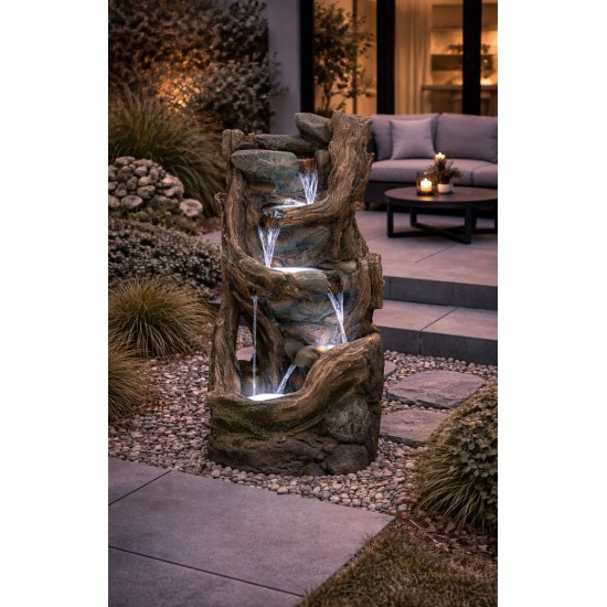 Drumbeg Rock Falls is a stylish garden water feature inspired by natural rock formations, bringing a calming atmosphere to any outdoor space. With dimensions L 45 x W 34 x H 98 cm, it fits perfectly on patios, terraces, or gardens. Integrated LED lighting enhances the flowing water effect at night, creating a stunning visual display. Made from durable weather-resistant resin, it ensures long-lasting performance. Mains powered for consistent water flow.