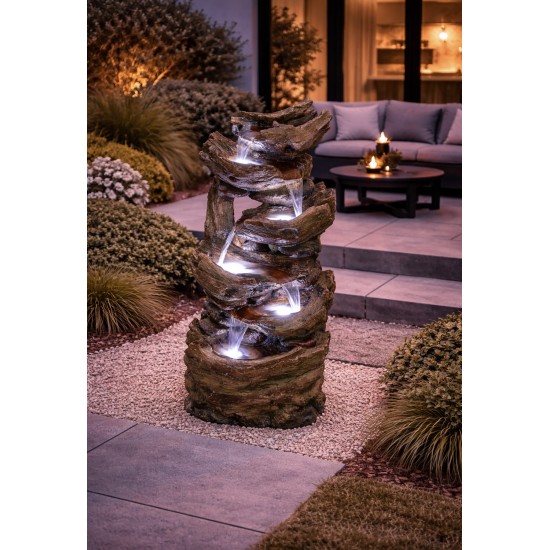 The Oregon Woodland Falls garden water feature is a beautifully crafted outdoor decoration inspired by natural woodland landscapes. Designed to enhance gardens, patios, and entrances, it features realistic wood and rock textures combined with cascading water flow. Integrated LED lighting highlights the movement of water, especially at night. Made from durable resin, it is weather resistant and suitable for outdoor use. Dimensions: L 47 x W 37 x H 105 cm, making it an eye-catching yet space-efficient feature.