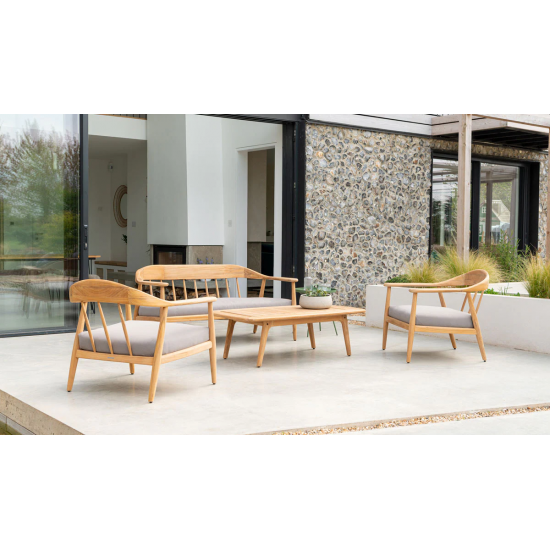 Dana 2-seater sofa presents mid-century inspired design with modern comfort, crafted from solid FSC®-certified teak with curved arms and elegant detailing. Designed for outdoor living and paired with soft cushions for a relaxed yet sophisticated seating experience.