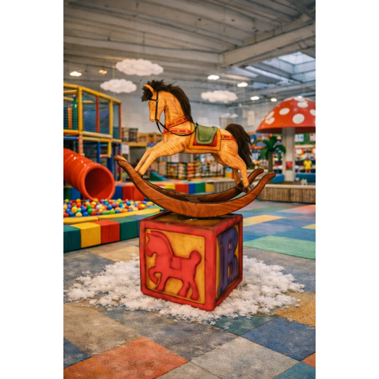 Rocking Horse on Letter Block is an animatronic Christmas decoration from the Creation Group collection, designed to enhance festive indoor displays. The scene features a classic rocking horse mounted on a decorative letter block, gently rocking back and forth to attract attention. It is ideal for shop windows, themed Christmas areas and retail environments. The product dimensions are 65 × 120 × 140 cm (L × W × H). It is intended for indoor use only.