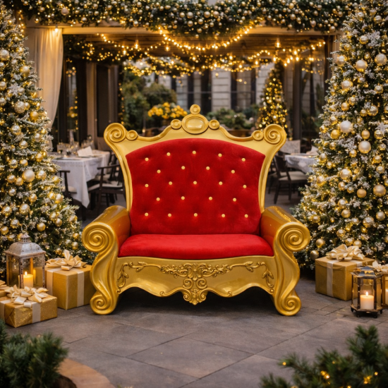The red and gold Santa Sofa is a life-size Christmas throne designed for shopping centres, hotels, theme parks and festive photo areas. Made from durable fibreglass resin with a fabric cushion and padded backrest, it comfortably seats up to two people. The luxurious red and gold colours create a warm festive atmosphere and make the sofa a perfect centrepiece for Santa photo opportunities.