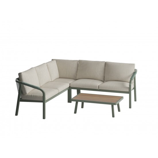 Elegant and durable, the Genoa Corner Lounge Set is designed to elevate your outdoor living experience. Perfect for gardens, patios, terraces or balconies, this set comprises a generously sized corner sofa and a matching coffee table, making it ideal for relaxed lounging or casual entertaining. The sofa includes left and right modules — each 1450 mm wide, 750 mm deep and 700 mm high — offering comfortable seating for up to five people. The set’s olive green powder-coated aluminium frame not only resists rust and weathering but also blends seamlessly with natural surroundings. Soft, high-quality 230gsm polyester cushion covers provide lasting comfort and are designed to withstand everyday outdoor conditions. The coordinating coffee table features responsibly sourced timber on top and measures 600 mm in width, 1060 mm in depth and 420 mm in height, providing a stylish and functional surface for drinks and décor. Together, these pieces create a cohesive outdoor lounge area that balances contemporary design with long-lasting performance. Backed by a 3-year warranty, this set represents a reliable and stylish investment in outdoor comfort and functionality.
