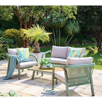 The Genoa Lounge Set is an elegant outdoor lounge furniture set designed for relaxed comfort and contemporary style. What’s included: 1 × 2-seater sofa, 2 × lounge chairs and 1 × coffee table, featuring olive green powder-coated aluminium frames with rope detailing, 230gsm polyester cushions and a responsibly sourced timber tabletop. Product specs: sofa: W 1450 mm × D 750 mm × H 700 mm; chair: W 700 mm × D 750 mm × H 700 mm; coffee table: W 600 mm × D 1060 mm × H 420 mm. Warranty: 3 years.