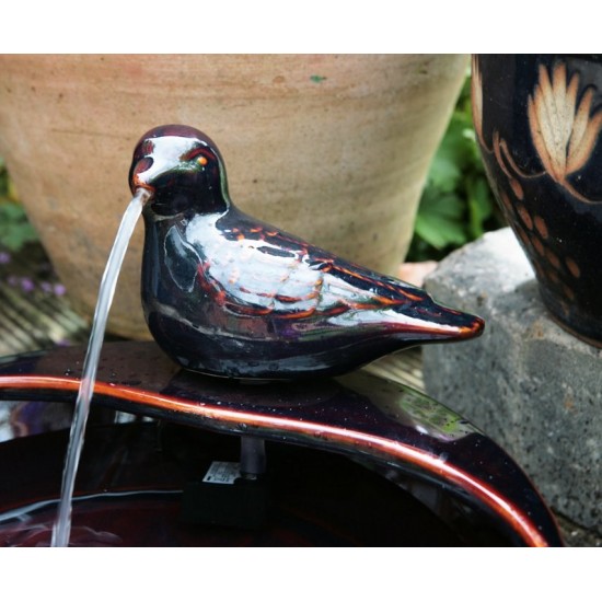 The 35cm Dove Solar Ceramic Water Feature measures 20cm height, 35cm width, 35cm depth. Crafted from durable glazed ceramic in brown. Powered by solar energy, includes a 6W pump (100 LPH) and 300cm cable. Fully self-contained with reservoir included. Designed for outdoor use, bowl-shaped design.