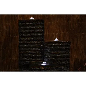 This modern, elegant water decoration has been cleverly camouflaged as made of fine granite and is currently made of high-quality polyester resin, which is much lighter and more practical than stone. The combination of a classic look and modern production techniques, polyester resin is frost and UV resistant, making it an ideal solution all year round. The water effervesces at the top of each column to then gently drain into the tank below. The LEDs at the top of each column not only illuminate the fountain, but also gently illuminate and emphasize the water itself, creating a simply stunning spectacle, guaranteed to bring the surroundings to life.