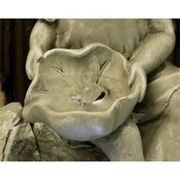 This little girl is pouring water into a tank from a shell she is holding in her hand. The fountain is made of organic resin and finished to look like a stone.