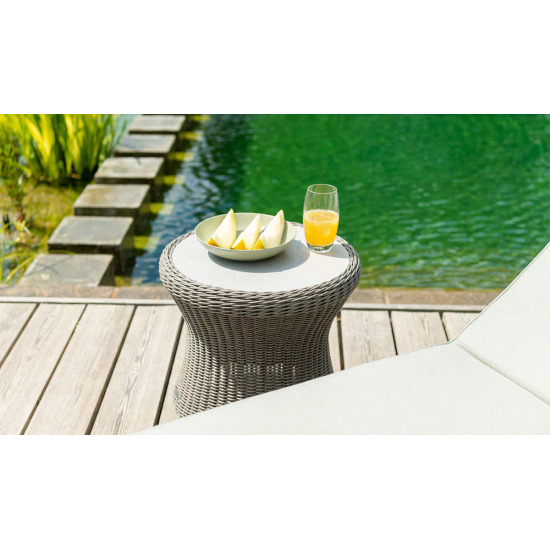 The Hazelmere Side Table is designed to complement outdoor lounge seating such as Hazelmere sunbeds, lazy chairs or sofas. Built with a lightweight aluminium frame and finished in a classic basket-style 4 mm round weave, this side table delivers a combination of robustness and refined texture. The ceramic effect tempered glass inset tabletop adds both durability and elegance, providing a stable surface for drinks or accessories. With compact dimensions of 450 mm width, 450 mm height and 450 mm depth, and weighing just 6 kg, it is easy to reposition around your outdoor seating arrangement as needed. The neutral weave colours integrate seamlessly with a variety of outdoor furniture palettes while the weather-resistant materials make it suitable for year-round use. Backed by a 3-year warranty on the frame, this side table offers peace of mind and lasting outdoor performance.