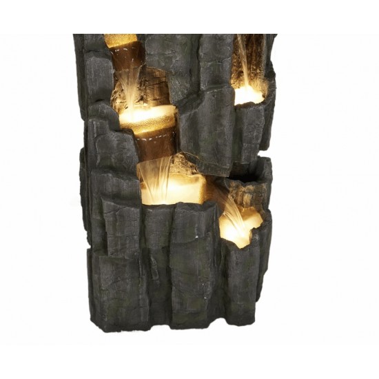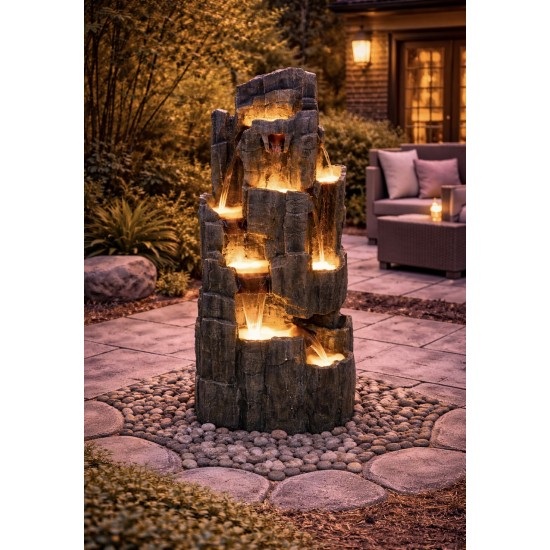 Killowen Slate Falls is a stylish garden water feature inspired by natural slate, perfect for patios and outdoor spaces. Made from durable resin, it is weather-resistant and enhanced with LED lighting for a striking visual effect. Dimensions according to Product Specification: L 48 x W 29 x H 130 cm, weight 21 kg. Mains powered for continuous water flow and a calming cascade effect.