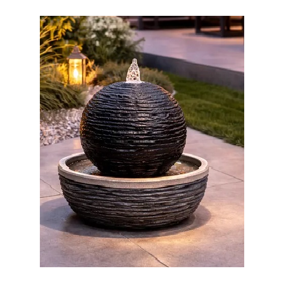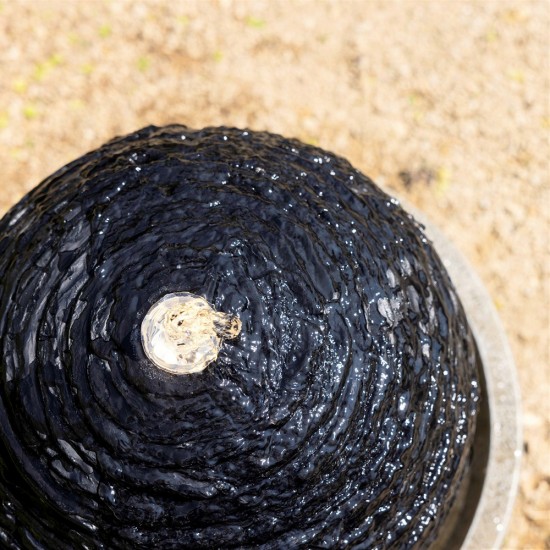 The Marvao sphere water feature measures 42 cm in height and 37 × 37 cm in width and depth, making it ideal for gardens, patios or balconies. Crafted from durable black polyresin with a realistic slate effect, it creates a contemporary focal point. The integrated 7 W pump with 430 LPH flow and built-in reservoir ensure easy installation via mains power. White LED lighting softly illuminates the cascading water, providing a tranquil atmosphere after dark.