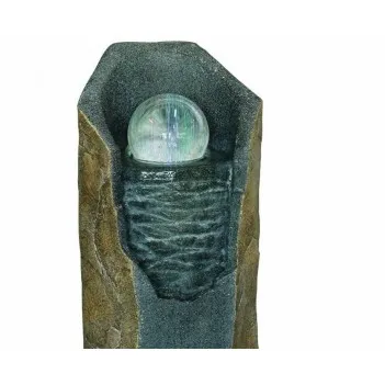 A magnificent stone fountain with a sparkling glass water ball that rotates.