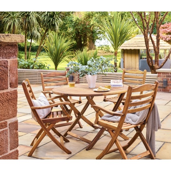 The Redcliffe Acacia Wood Folding Dining Table 1.1m brings timeless style and practical functionality to outdoor dining. Crafted from premium Acacia hardwood, this table features a warm golden-brown finish and distinctive grain, enhanced by a smooth hand-sanded texture and protective oil coating that helps guard against the elements. The generous 1.1 m round tabletop comfortably accommodates up to four people, making it perfect for relaxed lunches, evening drinks or morning coffees with friends and family. Its folding mechanism allows the table to collapse easily for convenient storage when not in use, making it especially suitable for smaller patios, balconies or garden areas. With sturdy construction and natural weather resistance, it’s designed to provide lasting service outdoors. Dimensions: 1100 mm width × 1100 mm depth × 740 mm height; Weight: approx. 17 kg. Backed by a 3-year warranty, it’s a reliable and elegant choice for outdoor dining.