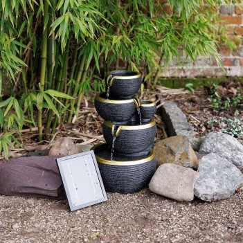 Measuring 46 × 32.5 × 29 cm, this compact three-tier fountain features black polyresin bowls with subtle gold edging. Powered entirely by solar energy, it includes a lithium battery for consistent operation without mains connection.