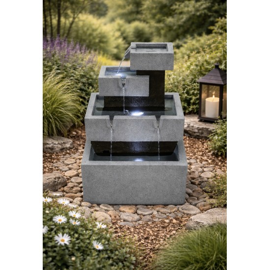 Solar Stacked Troughs is a contemporary solar-powered garden water feature designed with a stylish multi-level cascading structure. Water gently flows through stacked troughs creating a relaxing visual and acoustic effect in any outdoor setting. The durable resin construction ensures weather resistance while integrated LED lighting highlights the water flow during the evening. Designed for outdoor use, the feature runs on solar power, eliminating the need for wiring and making installation quick and simple.