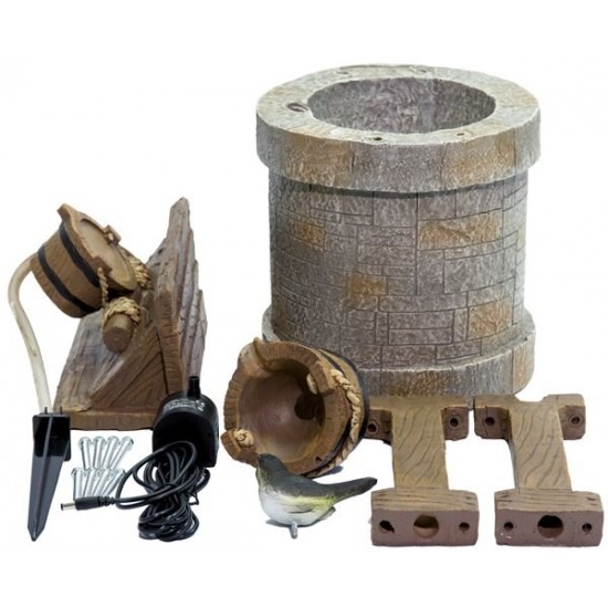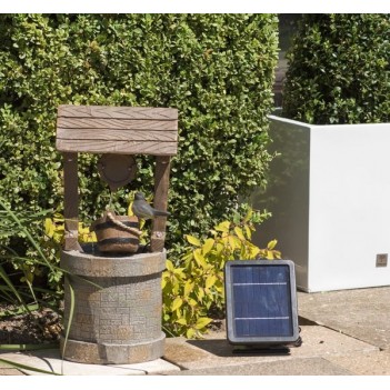 This rustic wishing well fountain enhances outdoor spaces with tranquil flowing water. Constructed from UV and frost resistant polyresin, it withstands outdoor conditions. Solar power eliminates mains wiring, allowing flexible placement. Fully self-contained system includes reservoir and pump. Simply connect pump to solar panel, place in sunlight and fill with water to enjoy soothing cascading sounds.