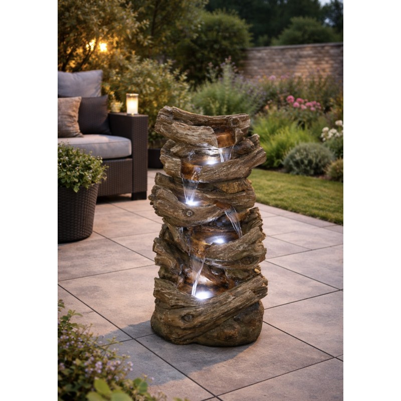 Integrated LED lighting enhances the flowing water effect at night, adding a warm and relaxing ambience to the surrounding garden environment. Constructed from durable resin, the fountain is both lightweight and weather resistant, ensuring long-lasting outdoor performance.