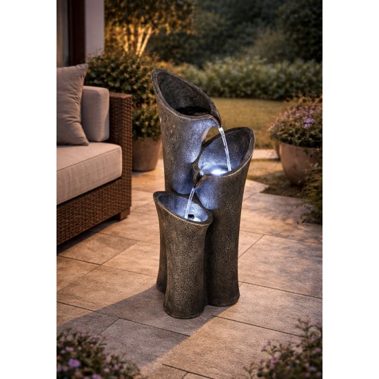 Solar Pouring Columns is a stylish solar powered garden water feature designed to bring relaxing movement and sound to outdoor spaces. The cascading bowl design creates the visual effect of water flowing between columns, producing a natural and calming ambience. Integrated LED lighting highlights the flowing water during the evening, creating an attractive focal point for gardens, patios or terraces. Powered entirely by solar energy, the fountain requires no electrical wiring, making installation simple and environmentally friendly. Crafted from durable weather-resistant resin, it is designed for outdoor use and long-lasting decorative appeal.