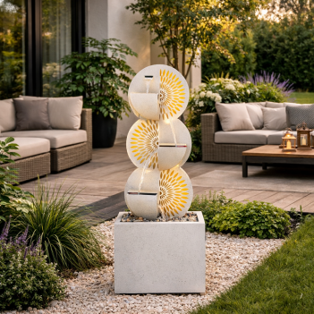 The fan-shaped cut-out design introduces a sculptural and decorative element that suits both modern and traditional garden styles. Backlit LED illumination highlights the flowing water and pattern details, creating depth and ambience in the evening. The neutral finish blends naturally with stone, timber and greenery.