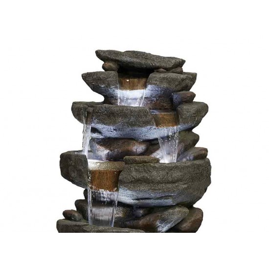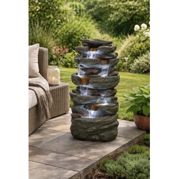 The Hammonton Rock Falls water feature is a stylish garden decoration inspired by natural cascading rocks, perfect for gardens, patios, and terraces. Made from durable weather-resistant resin, it provides a realistic stone effect and long-lasting use. Built-in LED lighting enhances the flowing water effect at night. Dimensions: L 50 x W 36 x H 103 cm. Mains powered for reliable performance.