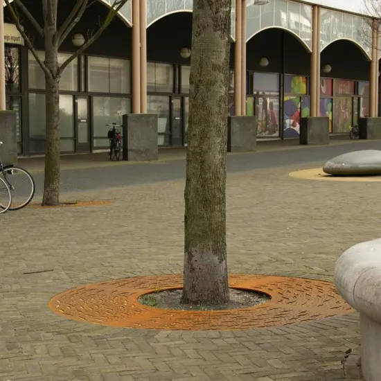 Corten steel grates for trees provide moisture and oxygen, protect the roots of trees.
