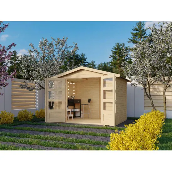 Le toit à pignon d'une superficie de 5,8 m² souligne le style classique et la disponibilité en deux variantes de couleurs - brun-gris et naturel - vous permet d'adapter la maison à vos préférences individuelles. Les doubles portes élégantes avec vitrage laissent entrer la lumière naturelle à l'intérieur tout en assurant la sécurité grâce à une serrure intégrée.