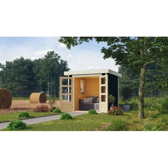 Abri de jardin Askola 2 – un accent dans votre jardin. La maison modulaire de 19 mm en épicéa nordique dans un système simple d'enfichage et de vis est disponible dans les couleurs brun-gris, anthracite et naturel.
