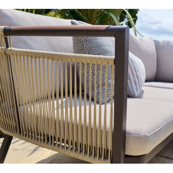L’ensemble Bali Lounge Set 4 pièces comprend 1 canapé 2 places, 2 fauteuils lounge et 1 table basse rectangulaire. Dimensions du canapé: 1800 × 710 × 710 mm; fauteuil: 710 × 860 × 710 mm; table: 600 × 1060 × 420 mm. Garantie: 3 ans. Construction en aluminium résistant à la corrosion et corde hydrophobe pour usage extérieur.