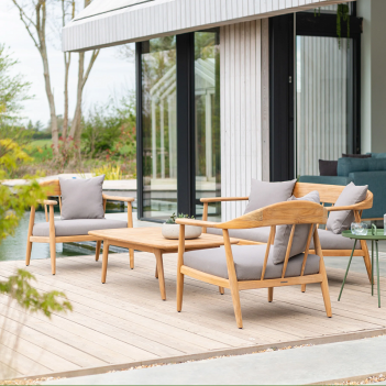 La chaise lounge Dana allie un design inspiré du mid-century à un confort moderne. Fabriquée en bois de teck de grande qualité, elle offre durabilité et robustesse pour les espaces extérieurs, tandis que le coussin en tissu Agora assure une assise confortable et raffinée.