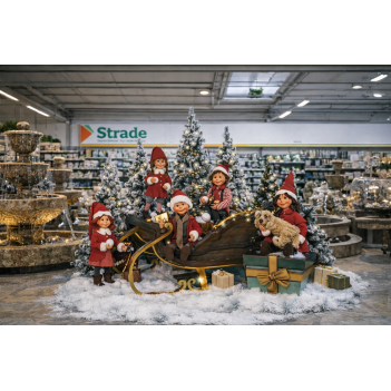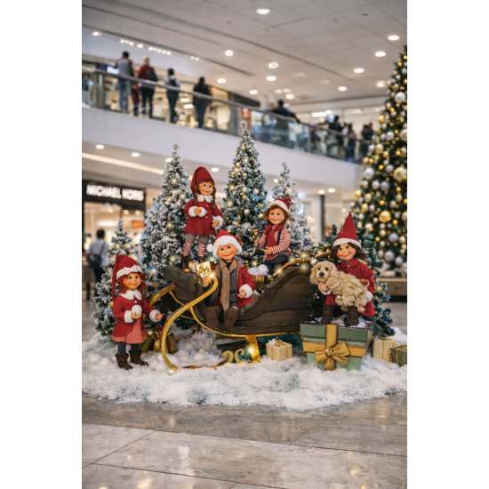 La scène animatronique Puppet Santas a été conçue comme une décoration de Noël captivante pour les espaces intérieurs professionnels. Elle présente cinq elfes joyeux – assistants du Père Noël, profitant d’un moment de détente et de convivialité après les préparatifs de Noël, créant ainsi une ambiance chaleureuse et festive.
