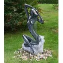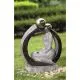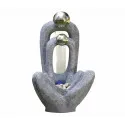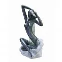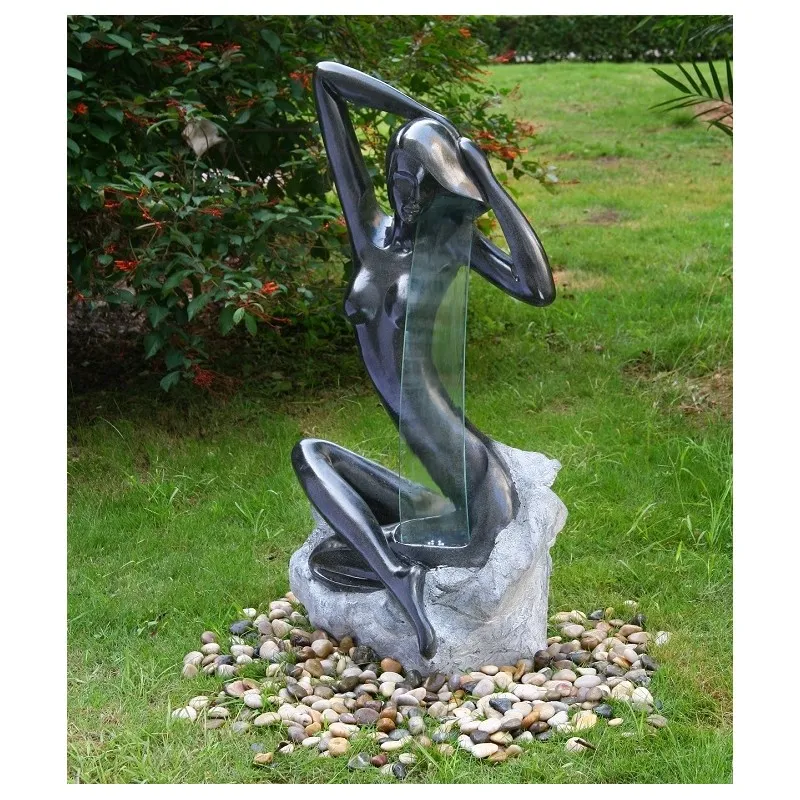 Une sculpture noire d'une femme assise avec une finition en marbre éclairée par un ensemble de LED. L'eau coule le long d'un mur en plexiglas transparent devant la dame et s'écoule dans le réservoir en dessous en faisant un son apaisant. Un ensemble de lumières LED ajoute un effet romantique à la fontaine, ce qui la rend particulièrement magnifique la nuit.