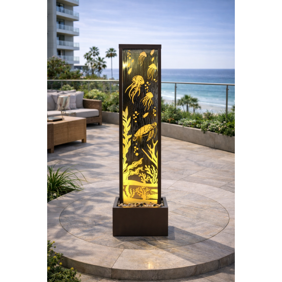 Le zinc résistant à la corrosion permet une utilisation extérieure toute l’année. La surface non poreuse facilite l’entretien et conserve son aspect esthétique. L’effet miroir reflète la lumière naturelle et agrandit visuellement l’espace. Son design vertical fin est idéal pour les zones étroites ou comme élément décoratif central. Le système autonome avec pompe 2000 LPH assure un cycle d’eau fermé sans installation complexe.